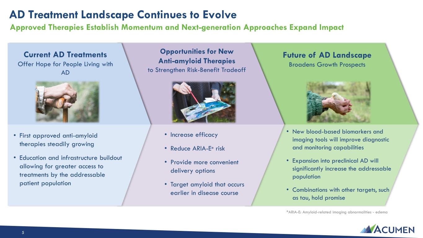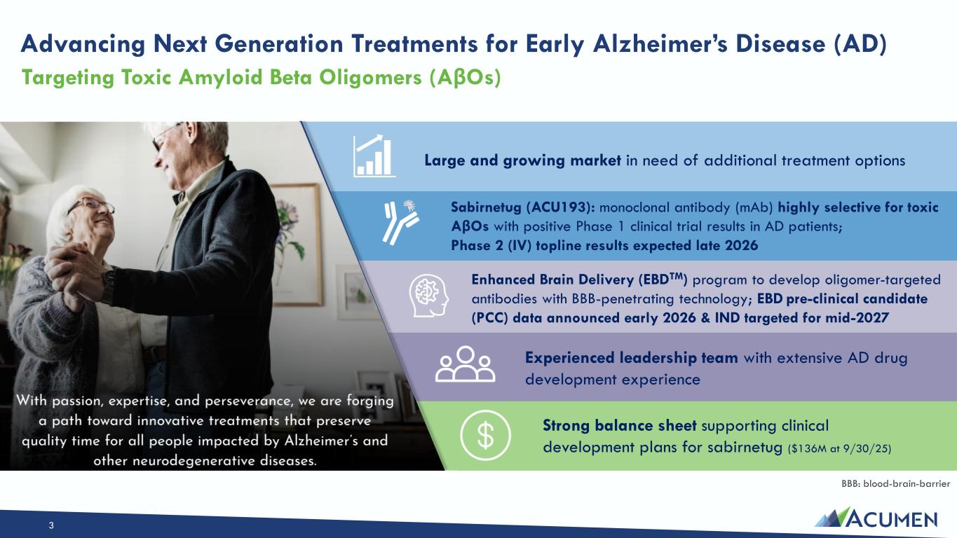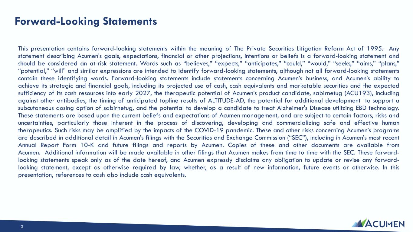 Forward-Looking Statements 2 This presentation contains forward-looking statements within the meaning of The Private Securities Litigation Reform Act of 1995. Any statement describing Acumen’s goals, expectations, financial or other projections, intentions or beliefs is a forward-looking statement and should be considered an at-risk statement. Words such as “believes,” “expects,” “anticipates,” “could,” “would,” “seeks,” “aims,” “plans,” “potential,” “will” and similar expressions are intended to identify forward-looking statements, although not all forward-looking statements contain these identifying words. Forward-looking statements include statements concerning Acumen’s business, and Acumen’s ability to achieve its strategic and financial goals, including its projected use of cash, cash equivalents and marketable securities and the expected sufficiency of its cash resources into early 2027, the therapeutic potential of Acumen’s product candidate, sabirnetug (ACU193), including against other antibodies, the timing of anticipated topline results of ALTITUDE-AD, the potential for additional development to support a subcutaneous dosing option of sabirnetug, and the potential to develop a candidate to treat Alzheimer's Disease utilizing EBD technology. These statements are based upon the current beliefs and expectations of Acumen management, and are subject to certain factors, risks and uncertainties, particularly those inherent in the process of discovering, developing and commercializing safe and effective human therapeutics. Such risks may be amplified by the impacts of the COVID-19 pandemic. These and other risks concerning Acumen’s programs are described in additional detail in Acumen’s filings with the Securities and Exchange Commission (“SEC”), including in Acumen’s most recent Annual Report Form 10-K and future filings and reports by Acumen. Copies of these and other documents are available from Acumen. Additional information will be made available in other filings that Acumen makes from time to time with the SEC. These forward- looking statements speak only as of the date hereof, and Acumen expressly disclaims any obligation to update or revise any forward- looking statement, except as otherwise required by law, whether, as a result of new information, future events or otherwise. In this presentation, references to cash also include cash equivalents.