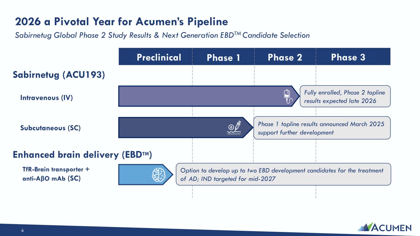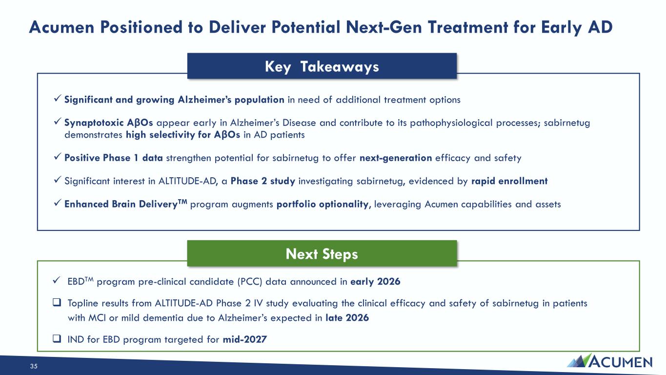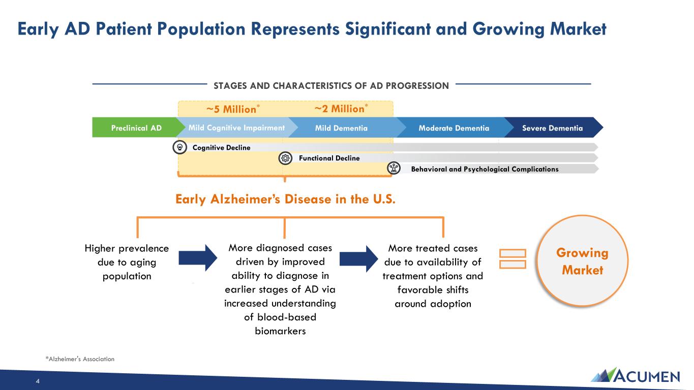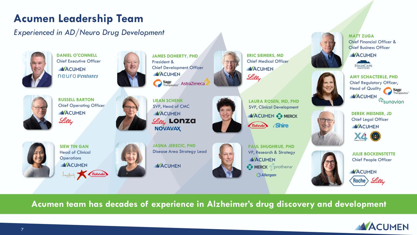 Forward-Looking Statements 2 This presentation contains forward-looking statements within the meaning of The Private Securities Litigation Reform Act of 1995. Any statement describing Acumen’s goals, expectations, financial or other projections, intentions or beliefs is a forward-looking statement and should be considered an at-risk statement. Words such as “believes,” “expects,” “anticipates,” “could,” “would,” “seeks,” “aims,” “plans,” “potential,” “will” and similar expressions are intended to identify forward-looking statements, although not all forward-looking statements contain these identifying words. Forward-looking statements include statements concerning Acumen’s business, and Acumen’s ability to achieve its strategic and financial goals, including its projected use of cash, cash equivalents and marketable securities and the expected sufficiency of its cash resources into early 2027, the therapeutic potential of Acumen’s product candidate, sabirnetug (ACU193), including against other antibodies, the timing of anticipated topline results of ALTITUDE-AD, the potential for additional development to support a subcutaneous dosing option of sabirnetug, and the potential to develop a candidate to treat Alzheimer's Disease utilizing EBD technology. These statements are based upon the current beliefs and expectations of Acumen management, and are subject to certain factors, risks and uncertainties, particularly those inherent in the process of discovering, developing and commercializing safe and effective human therapeutics. Such risks may be amplified by the impacts of the COVID-19 pandemic. These and other risks concerning Acumen’s programs are described in additional detail in Acumen’s filings with the Securities and Exchange Commission (“SEC”), including in Acumen’s most recent Annual Report Form 10-K and future filings and reports by Acumen. Copies of these and other documents are available from Acumen. Additional information will be made available in other filings that Acumen makes from time to time with the SEC. These forward- looking statements speak only as of the date hereof, and Acumen expressly disclaims any obligation to update or revise any forward- looking statement, except as otherwise required by law, whether, as a result of new information, future events or otherwise. In this presentation, references to cash also include cash equivalents.