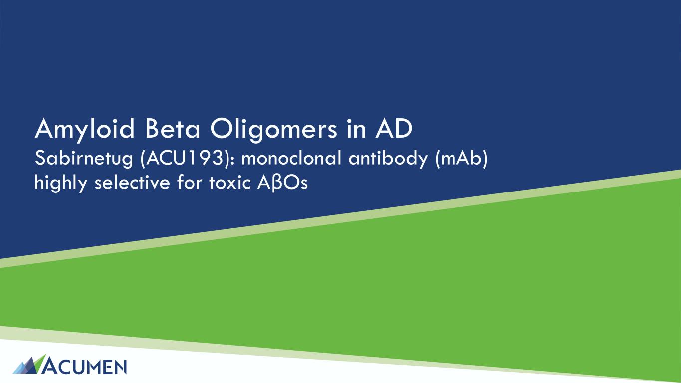 Amyloid Beta Oligomers in AD Sabirnetug (ACU193): monoclonal antibody (mAb) highly selective for toxic AβOs