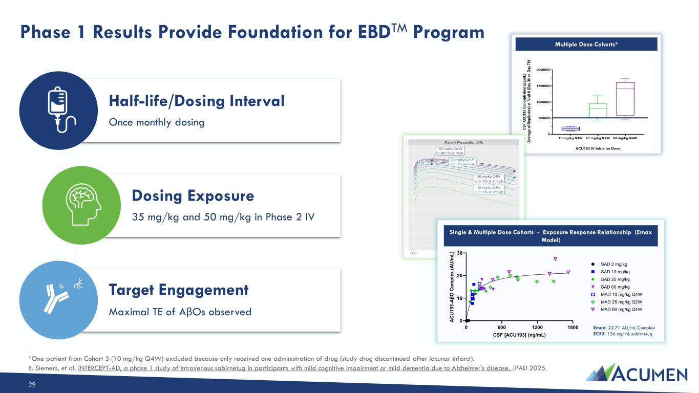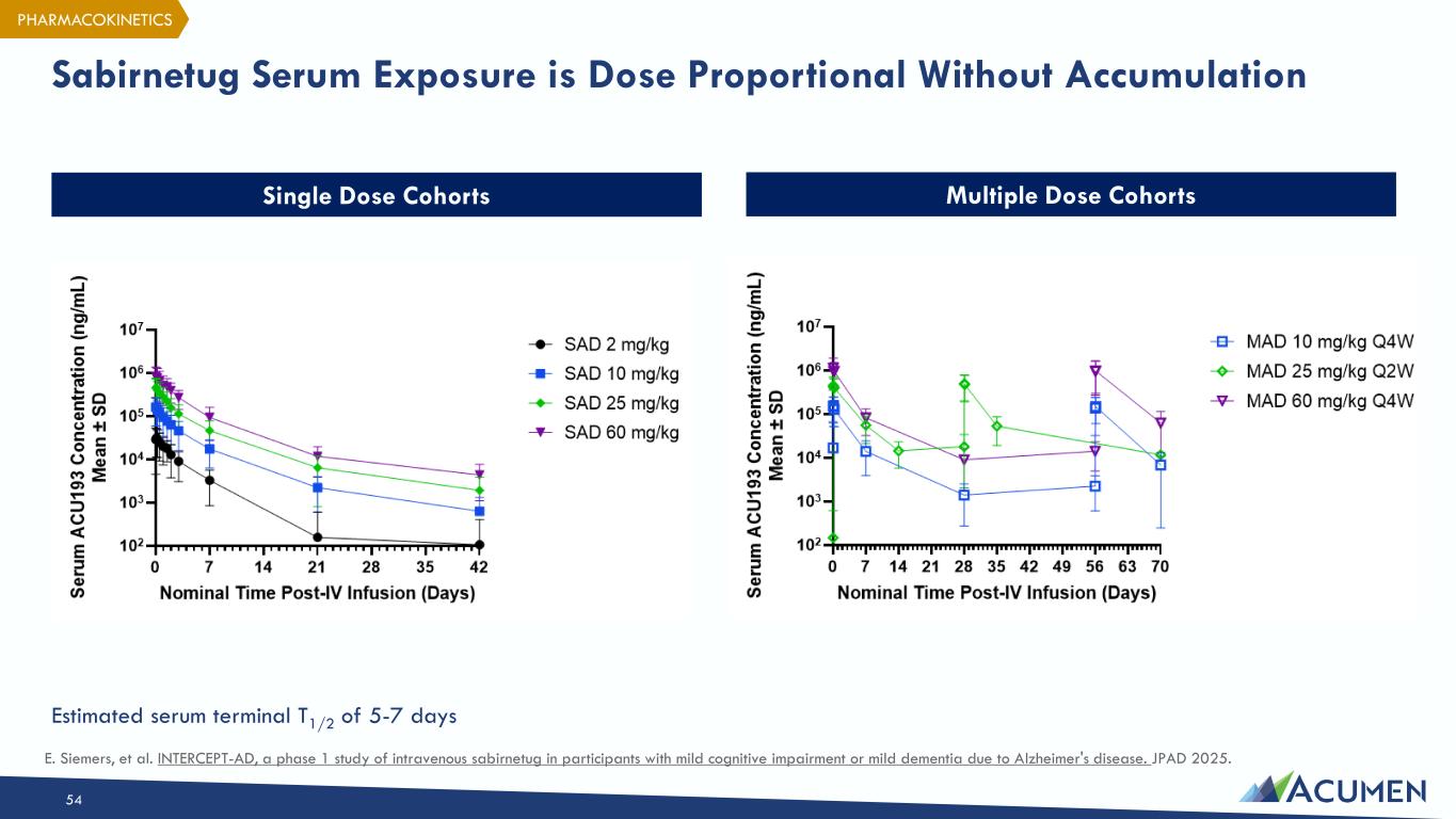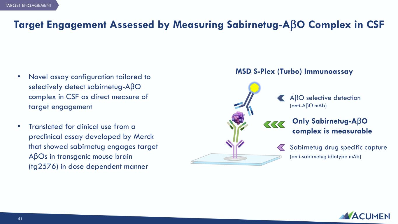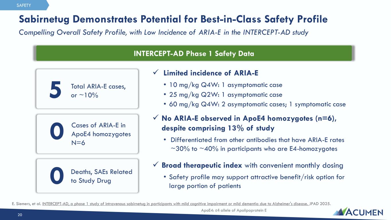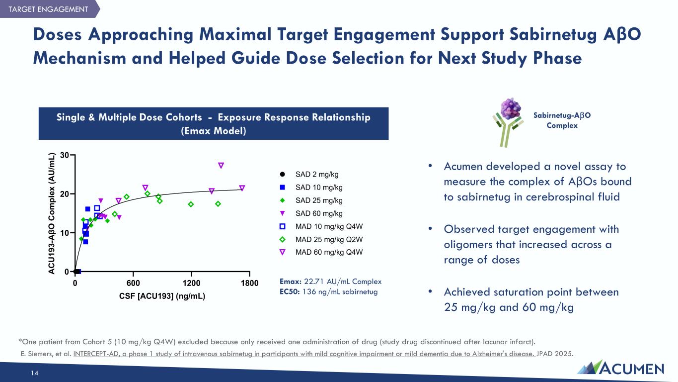Doses Approaching Maximal Target Engagement Support Sabirnetug AβO Mechanism and Helped Guide Dose Selection for Next Study Phase 14 Single & Multiple Dose Cohorts - Exposure Response Relationship (Emax Model) Emax: 22.71 AU/mL Complex EC50: 136 ng/mL sabirnetug 0 600 1200 1800 0 10 20 30 CSF [ACU193] (ng/mL) A C U 1 9 3 -A β O C o m p le x ( A U /m L ) SAD 2 mg/kg SAD 10 mg/kg SAD 25 mg/kg SAD 60 mg/kg MAD 10 mg/kg Q4W MAD 60 mg/kg Q4W MAD 25 mg/kg Q2W Sabirnetug-AO Complex TARGET ENGAGEMENT *One patient from Cohort 5 (10 mg/kg Q4W) excluded because only received one administration of drug (study drug discontinued after lacunar infarct). E. Siemers, et al. INTERCEPT-AD, a phase 1 study of intravenous sabirnetug in participants with mild cognitive impairment or mild dementia due to Alzheimer's disease. JPAD 2025. • Acumen developed a novel assay to measure the complex of AβOs bound to sabirnetug in cerebrospinal fluid • Observed target engagement with oligomers that increased across a range of doses • Achieved saturation point between 25 mg/kg and 60 mg/kg
