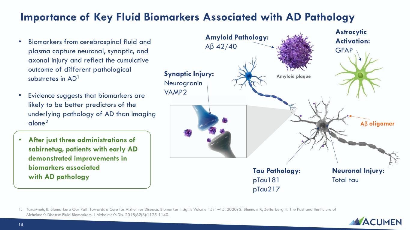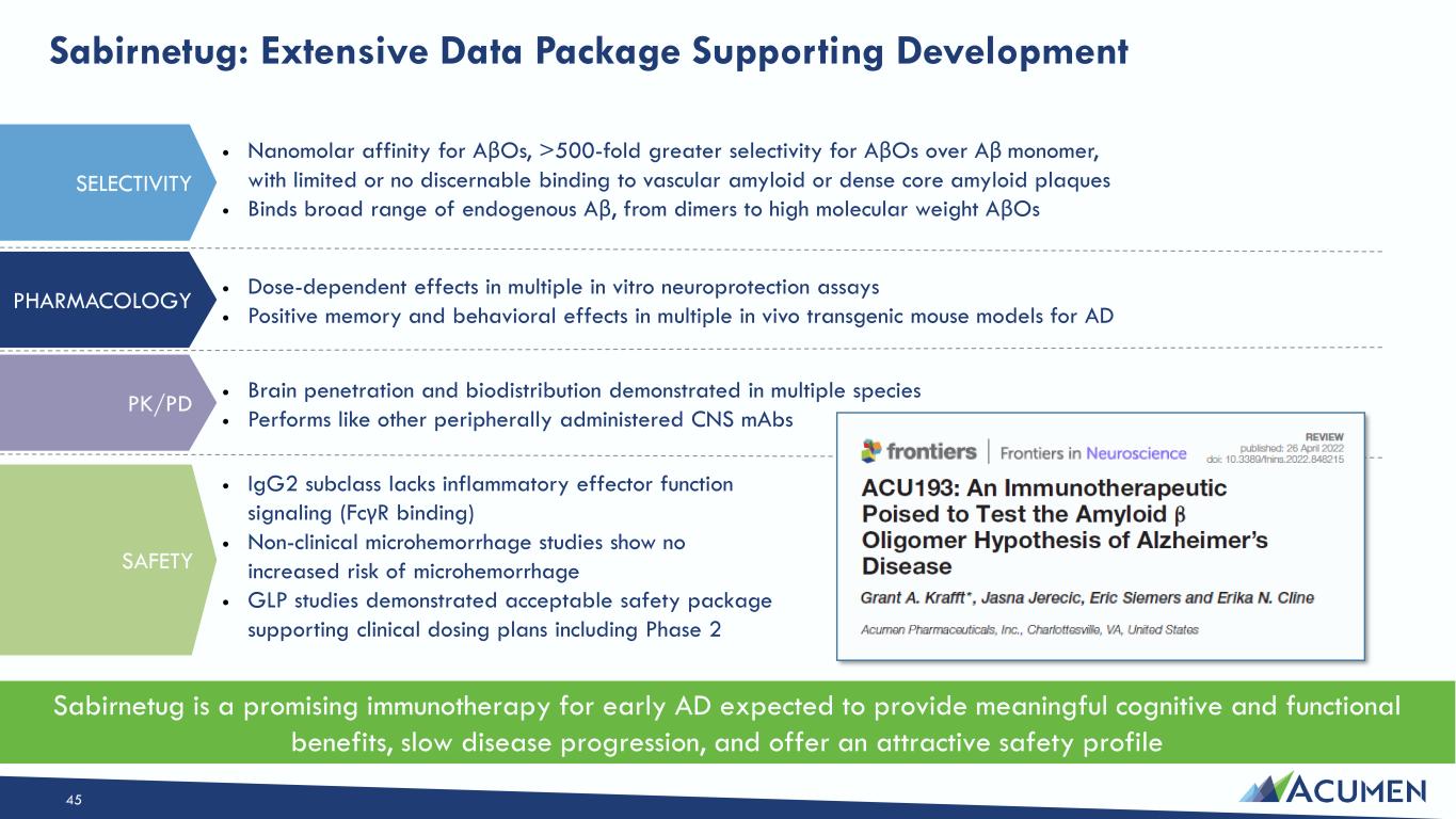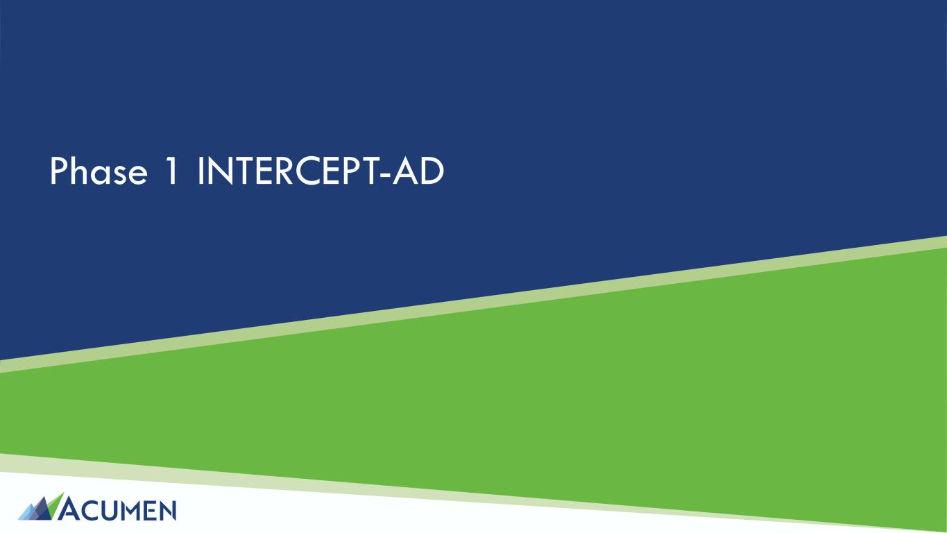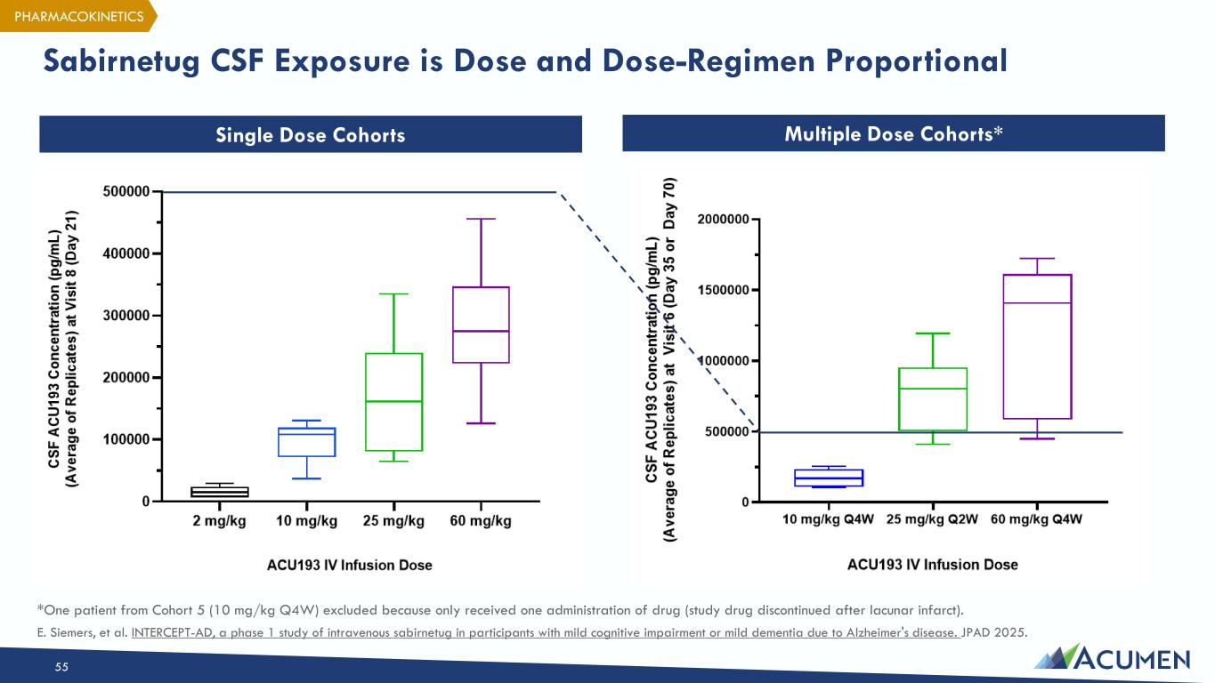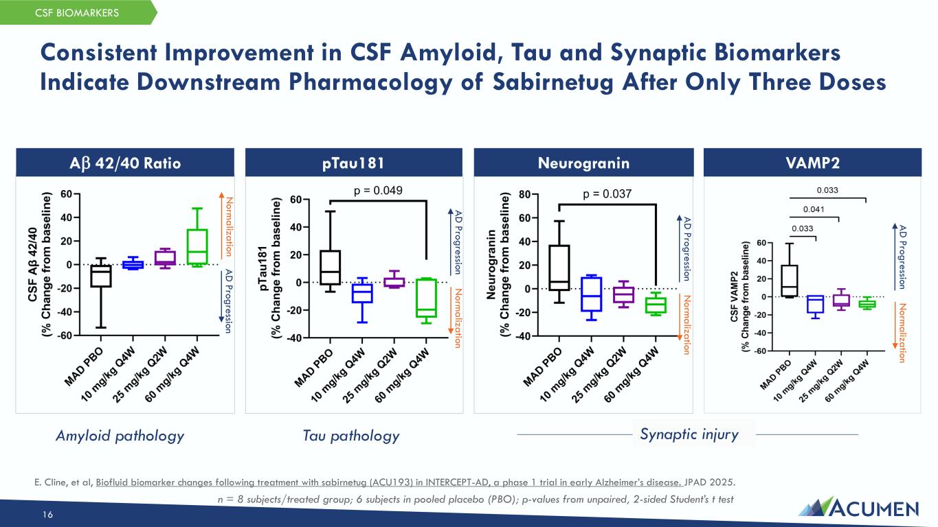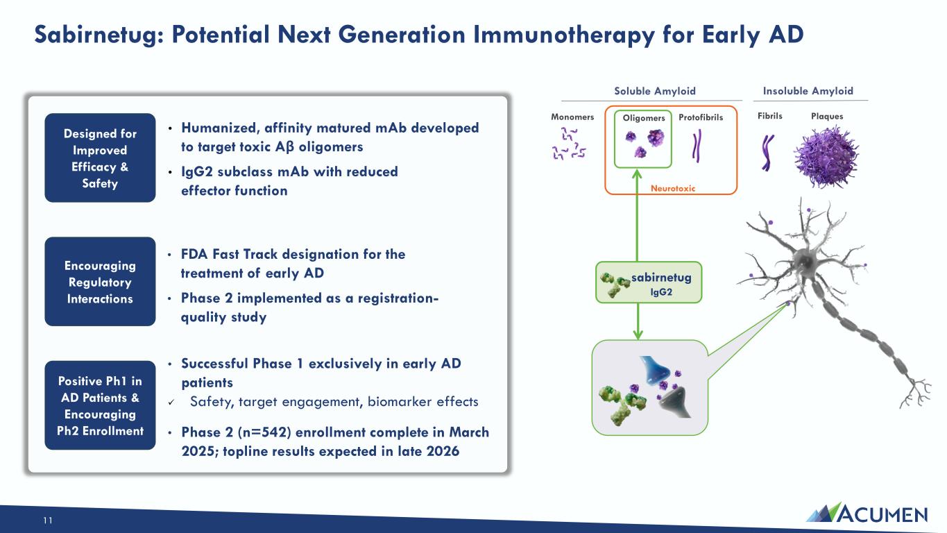 Doses Approaching Maximal Target Engagement Support Sabirnetug AβO Mechanism and Helped Guide Dose Selection for Next Study Phase 14 Single & Multiple Dose Cohorts - Exposure Response Relationship (Emax Model) Emax: 22.71 AU/mL Complex EC50: 136 ng/mL sabirnetug 0 600 1200 1800 0 10 20 30 CSF [ACU193] (ng/mL) A C U 1 9 3 -A β O C o m p le x ( A U /m L ) SAD 2 mg/kg SAD 10 mg/kg SAD 25 mg/kg SAD 60 mg/kg MAD 10 mg/kg Q4W MAD 60 mg/kg Q4W MAD 25 mg/kg Q2W Sabirnetug-AO Complex TARGET ENGAGEMENT *One patient from Cohort 5 (10 mg/kg Q4W) excluded because only received one administration of drug (study drug discontinued after lacunar infarct). E. Siemers, et al. INTERCEPT-AD, a phase 1 study of intravenous sabirnetug in participants with mild cognitive impairment or mild dementia due to Alzheimer's disease. JPAD 2025. • Acumen developed a novel assay to measure the complex of AβOs bound to sabirnetug in cerebrospinal fluid • Observed target engagement with oligomers that increased across a range of doses • Achieved saturation point between 25 mg/kg and 60 mg/kg