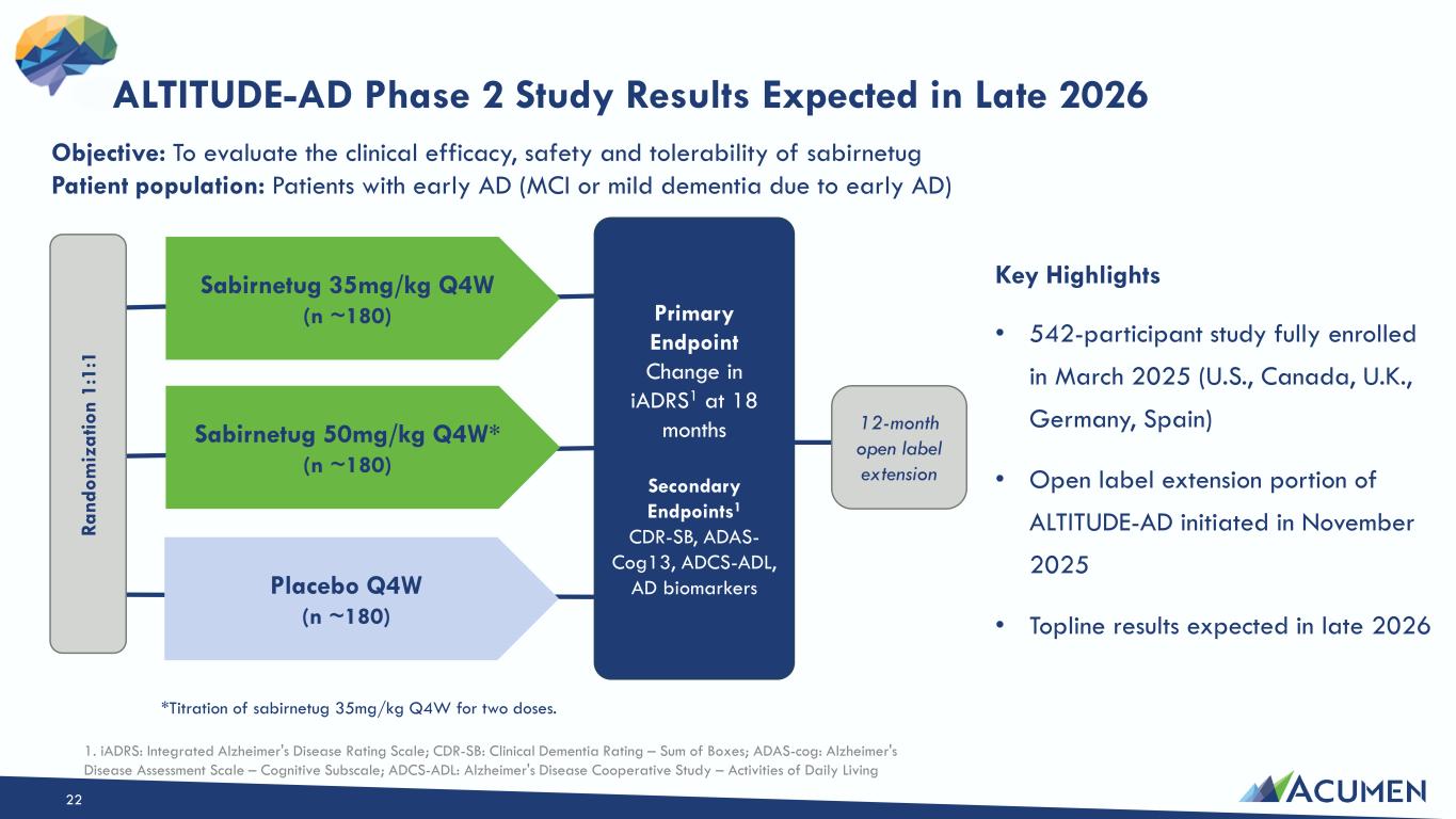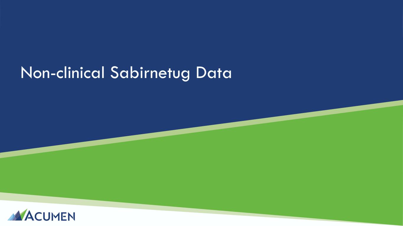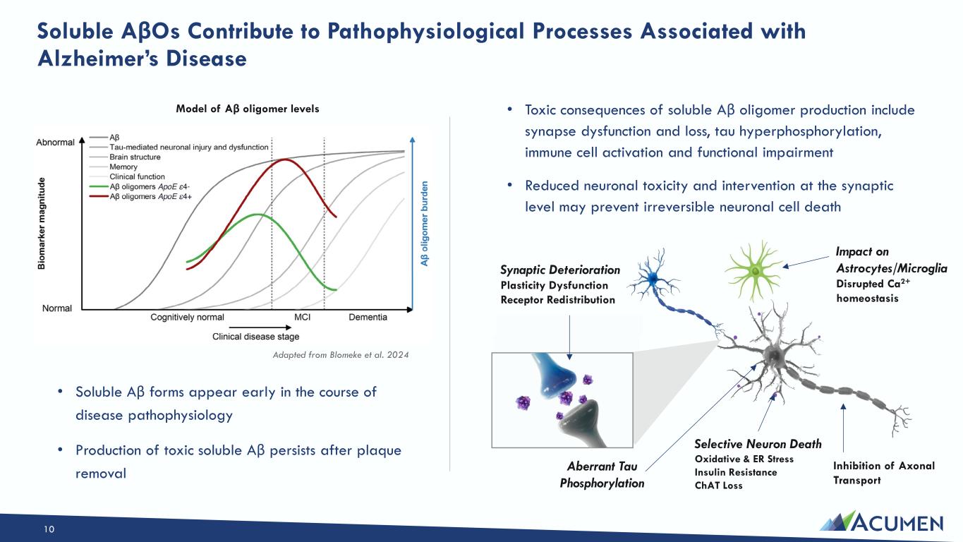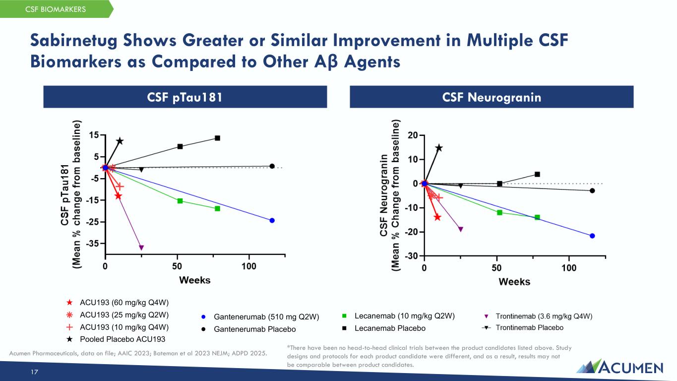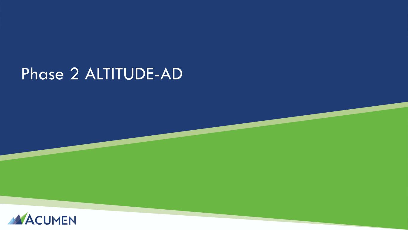 Doses Approaching Maximal Target Engagement Support Sabirnetug AβO Mechanism and Helped Guide Dose Selection for Next Study Phase 14 Single & Multiple Dose Cohorts - Exposure Response Relationship (Emax Model) Emax: 22.71 AU/mL Complex EC50: 136 ng/mL sabirnetug 0 600 1200 1800 0 10 20 30 CSF [ACU193] (ng/mL) A C U 1 9 3 -A β O C o m p le x ( A U /m L ) SAD 2 mg/kg SAD 10 mg/kg SAD 25 mg/kg SAD 60 mg/kg MAD 10 mg/kg Q4W MAD 60 mg/kg Q4W MAD 25 mg/kg Q2W Sabirnetug-AO Complex TARGET ENGAGEMENT *One patient from Cohort 5 (10 mg/kg Q4W) excluded because only received one administration of drug (study drug discontinued after lacunar infarct). E. Siemers, et al. INTERCEPT-AD, a phase 1 study of intravenous sabirnetug in participants with mild cognitive impairment or mild dementia due to Alzheimer's disease. JPAD 2025. • Acumen developed a novel assay to measure the complex of AβOs bound to sabirnetug in cerebrospinal fluid • Observed target engagement with oligomers that increased across a range of doses • Achieved saturation point between 25 mg/kg and 60 mg/kg
