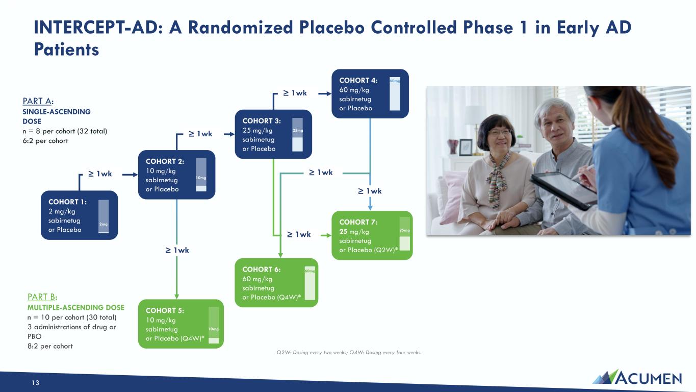 Q2W: Dosing every two weeks; Q4W: Dosing every four weeks. PART A: SINGLE-ASCENDING DOSE n = 8 per cohort (32 total) 6:2 per cohort PART B: MULTIPLE-ASCENDING DOSE n = 10 per cohort (30 total) 3 administrations of drug or PBO 8:2 per cohort COHORT 1: 2 mg/kg sabirnetug or Placebo 2mg COHORT 2: 10 mg/kg sabirnetug or Placebo 10mg COHORT 3: 25 mg/kg sabirnetug or Placebo 25mg COHORT 4: 60 mg/kg sabirnetug or Placebo 60mg COHORT 5: 10 mg/kg sabirnetug or Placebo (Q4W)* 10mg COHORT 6: 60 mg/kg sabirnetug or Placebo (Q4W)* 60mg COHORT 7: 25 mg/kg sabirnetug or Placebo (Q2W)* ≥ 1wk ≥ 1wk ≥ 1wk ≥ 1wk ≥ 1wk ≥ 1wk 25mg ≥ 1wk INTERCEPT-AD: A Randomized Placebo Controlled Phase 1 in Early AD Patients 13