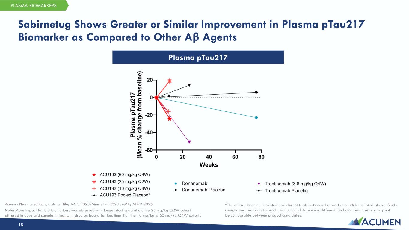 Sabirnetug Shows Greater or Similar Improvement in Multiple CSF Biomarkers as Compared to Other Aβ Agents 17 CSF BIOMARKERS CSF NeurograninCSF pTau181 50 100 -35 -25 -15 -5 5 15 Weeks C S F p T a u 1 8 1 (M e a n % c h a n g e f ro m b a s e li n e ) Gantenerumab (510 mg Q2W) Gantenerumab Placebo ACU193 (60 mg/kg Q4W) ACU193 (25 mg/kg Q2W) ACU193 (10 mg/kg Q4W) Pooled Placebo ACU193 Lecanemab (10 mg/kg Q2W) Lecanemab Placebo Trontinemab (3.6 mg/kg Q4W) C S F p T a u 1 8 1 (M e a n % c h a n g e f ro m b a s e li n e ) 50 100 -35 -25 -15 -5 5 15 Weeks C S F p T a u 1 8 1 (M e a n % c h a n g e f ro m b a s e li n e ) Gantenerumab (510 mg Q2W) Gantenerumab Placebo ACU193 (60 mg/kg Q4W) ACU193 (25 mg/kg Q2W) ACU193 (10 mg/kg Q4W) Pooled Placebo ACU193 Lecanemab (10 mg/kg Q2W) Lecanemab Placebo Trontinemab (3.6 mg/kg Q4W) 50 100 -35 -25 -15 -5 5 15 Weeks C S F p T a u 1 8 1 (M e a n % c h a n g e f ro m b a s e li n e ) Gantenerumab (510 mg Q2W) Gantenerumab Placebo ACU193 (60 mg/kg Q4W) ACU193 (25 mg/kg Q2W) ACU193 (10 mg/kg Q4W) Pooled Placebo ACU193 Lecanemab (10 mg/kg Q2W) Lecanemab Placebo Trontinemab (3.6 mg/kg Q4W) *There have been no head-to-head clinical trials between the product candidates listed above. Study designs and protocols for each product candidate were different, and as a result, results may not be comparable between product candidates. Acumen Pharmaceuticals, data on file; AAIC 2023; Bateman et al 2023 NEJM; ADPD 2025.