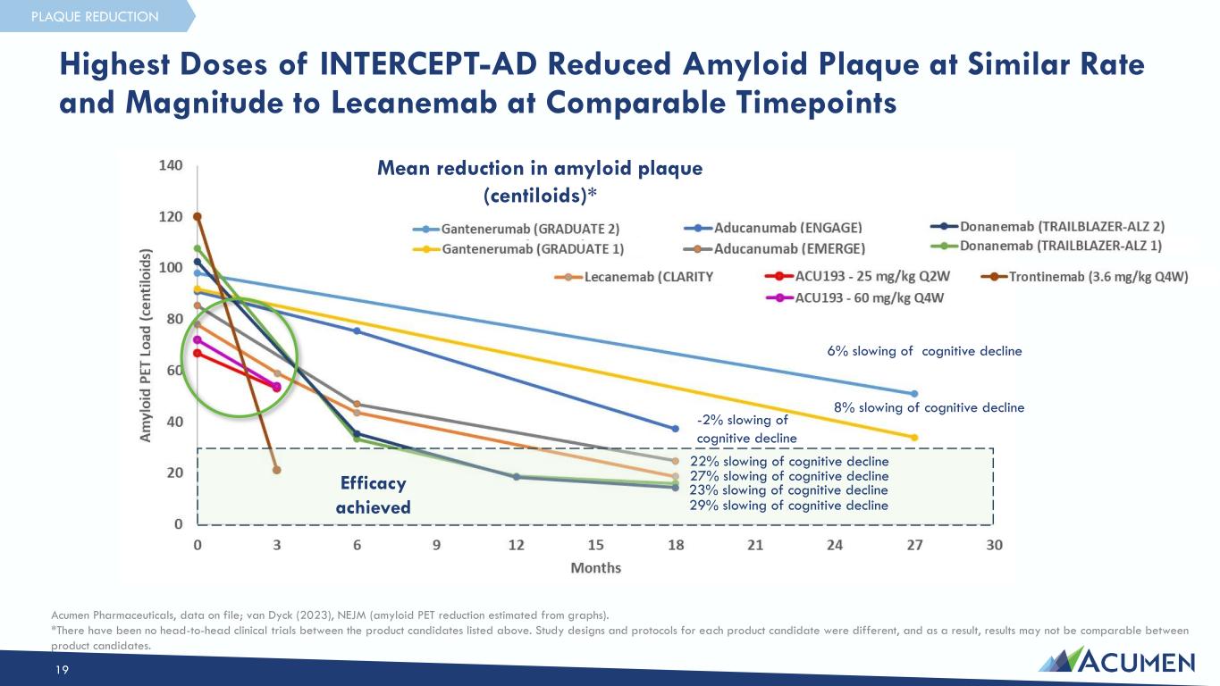 Sabirnetug Shows Greater or Similar Improvement in Plasma pTau217 Biomarker as Compared to Other Aβ Agents 18 PLASMA BIOMARKERS Plasma pTau217 *There have been no head-to-head clinical trials between the product candidates listed above. Study designs and protocols for each product candidate were different, and as a result, results may not be comparable between product candidates. Acumen Pharmaceuticals, data on file; AAIC 2023; Sims et al 2023 JAMA; ADPD 2025. Note: More impact to fluid biomarkers was observed with longer dosing duration; the 25 mg/kg Q2W cohort differed in dose and sample timing, with drug on board for less time than the 10 mg/kg & 60 mg/kg Q4W cohorts