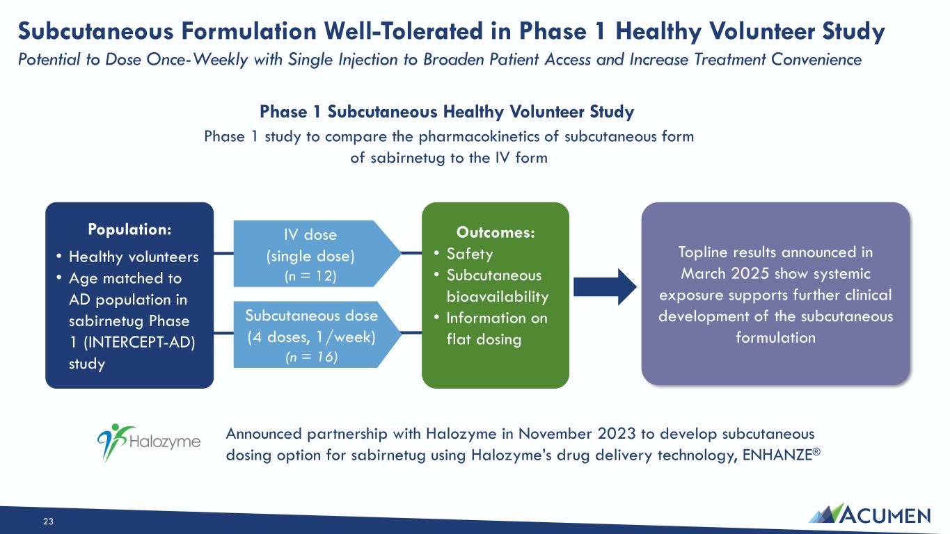 R a n d o m iz a ti o n 1 :1 :1 Sabirnetug 35mg/kg Q4W (n ~180) Sabirnetug 50mg/kg Q4W* (n ~180) Placebo Q4W (n ~180) Primary Endpoint Change in iADRS1 at 18 months Secondary Endpoints1 CDR-SB, ADAS- Cog13, ADCS-ADL, AD biomarkers 12-month open label extension Objective: To evaluate the clinical efficacy, safety and tolerability of sabirnetug Patient population: Patients with early AD (MCI or mild dementia due to early AD) ALTITUDE-AD Phase 2 Study Results Expected in Late 2026 1. iADRS: Integrated Alzheimer's Disease Rating Scale; CDR-SB: Clinical Dementia Rating – Sum of Boxes; ADAS-cog: Alzheimer's Disease Assessment Scale – Cognitive Subscale; ADCS-ADL: Alzheimer's Disease Cooperative Study – Activities of Daily Living 22 *Titration of sabirnetug 35mg/kg Q4W for two doses. • 542-participant study fully enrolled in March 2025 (U.S., Canada, U.K., Germany, Spain) • Open label extension portion of ALTITUDE-AD initiated in November 2025 • Topline results expected in late 2026 Key Highlights