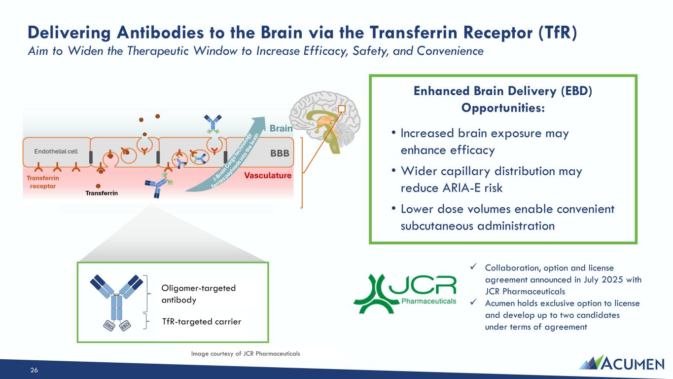 Acumen’s EBDTM program is part of an ongoing collaboration between Acumen and JCR announced in July 2025. J-Brain Cargo® technology is JCR’s proprietary drug delivery system that efficiently delivers drugs to target tissues, including the central nervous system, through receptor-mediated transcytosis. It is applicable to various modalities including antibodies, enzymes, oligonucleotides, lipid nanoparticles, gene and cell therapy, peptides and decoy receptors.