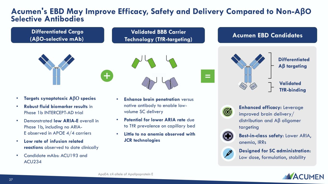 26 Delivering Antibodies to the Brain via the Transferrin Receptor (TfR) Aim to Widen the Therapeutic Window to Increase Efficacy, Safety, and Convenience • Increased brain exposure may enhance efficacy • Wider capillary distribution may reduce ARIA-E risk • Lower dose volumes enable convenient subcutaneous administration Enhanced Brain Delivery (EBD) Opportunities: Oligomer-targeted antibody TfR-targeted carrier ✓ Collaboration, option and license agreement announced in July 2025 with JCR Pharmaceuticals ✓ Acumen holds exclusive option to license and develop up to two candidates under terms of agreement Image courtesy of JCR Pharmaceuticals