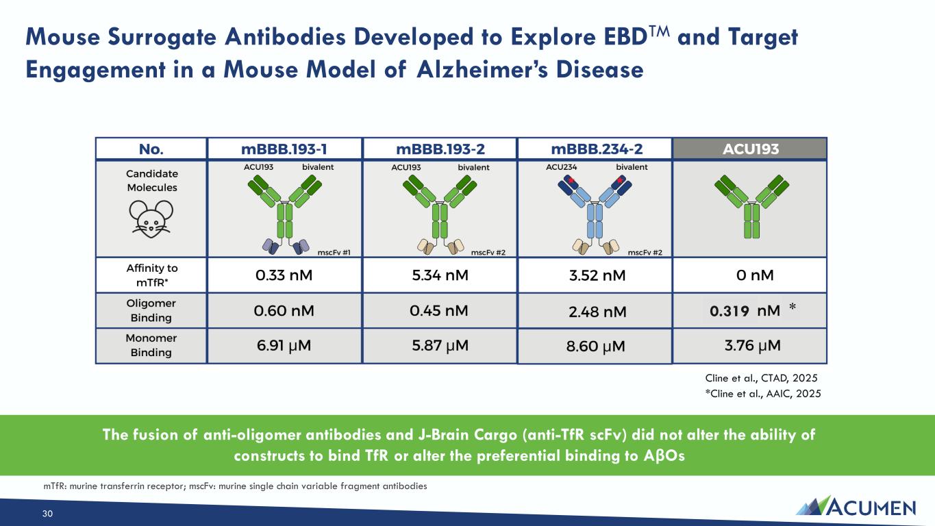 •Financing demonstrates conviction in oligomer-selective approach and follows strong preclinical data, including in vitro, in vivo and non-human primate study results, that support development candidates in Acumen’s transferrin-receptor targeting Enhanced Brain Delivery (EBDTM) program