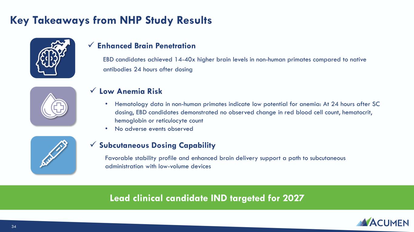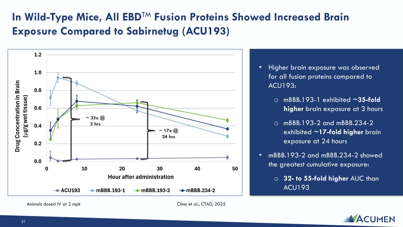 On March 16, 2026, Acumen also announced certain preclinical data, including in vitro, in vivo and NHP study results, that support development candidates in Acumen’s EBD program, conducted utilizing JCR Pharmaceuticals’ (“JCR”) blood-brain barrier penetrating technology, J-Brain Cargo®. The development candidate results are consistent and predictive across in vitro and in vivo studies, including murine and NHP data. Findings include: