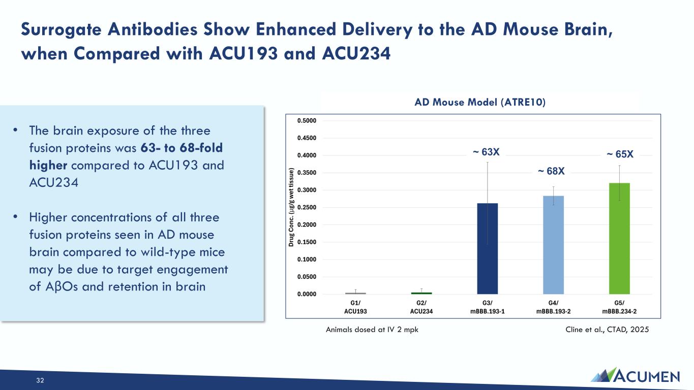 Animals dosed IV at 2 mpk Cline et al., CTAD, 2025 • Higher brain exposure was observed for all fusion proteins compared to ACU193: o mBBB.193-1 exhibited ~35-fold higher brain exposure at 3 hours o mBBB.193-2 and mBBB.234-2 exhibited ~17-fold higher brain exposure at 24 hours • mBBB.193-2 and mBBB.234-2 showed the greatest cumulative exposure: o 32- to 55-fold higher AUC than ACU193 In Wild-Type Mice, All EBDTM Fusion Proteins Showed Increased Brain Exposure Compared to Sabirnetug (ACU193) ~ 35x @ 3 hrs ~ 17x @ 24 hrs 31