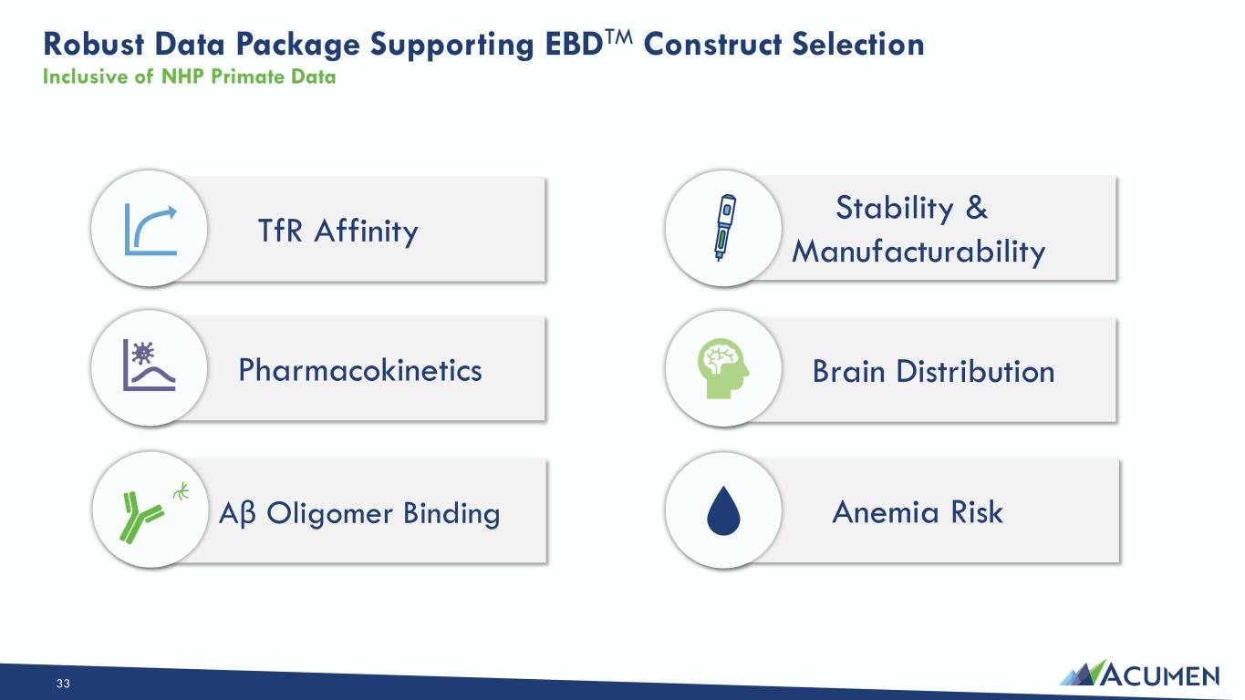 Robust Data Package Supporting EBDTM Construct Selection Inclusive of NHP Primate Data Anemia Risk Brain Distribution Stability & Manufacturability Pharmacokinetics TfR Affinity 33 Aβ Oligomer Binding