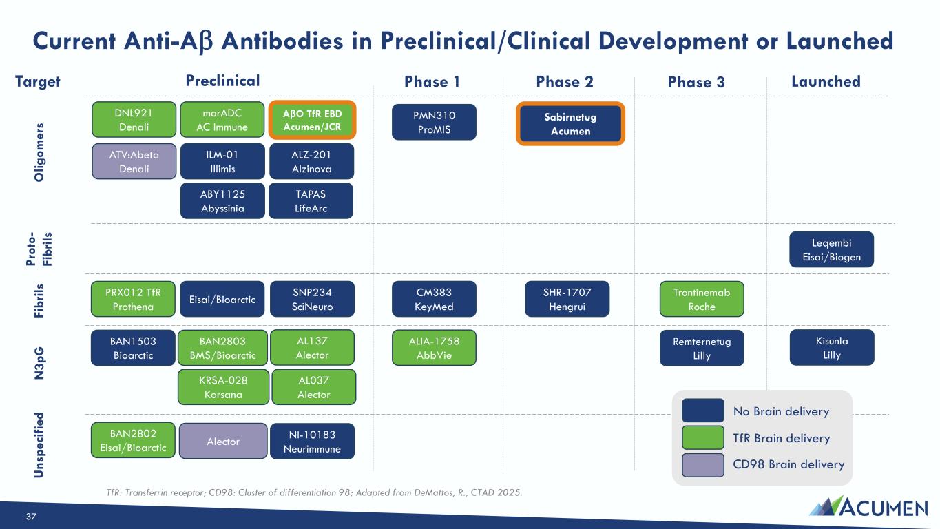 Current Anti-A Antibodies in Preclinical/Clinical Development or Launched O li g o m e rs Target Preclinical Phase 1 Phase 2 Phase 3 Launched Sabirnetug Acumen PMN310 ProMIS CM383 KeyMed Trontinemab Roche Leqembi Eisai/Biogen Kisunla Lilly Remternetug Lilly ALIA-1758 AbbVie TAPAS LifeArc ILM-01 Illimis ABY1125 Abyssinia AβO TfR EBD Acumen/JCR ALZ-201 Alzinova morADC AC Immune DNL921 Denali ATV:Abeta Denali BAN2802 Eisai/Bioarctic SNP234 SciNeuro BAN1503 Bioarctic AL137 Alector AL037 Alector Eisai/Bioarctic PRX012 TfR Prothena BAN2803 BMS/Bioarctic TfR Brain deliveryAlector CD98 Brain delivery TfR: Transferrin receptor; CD98: Cluster of differentiation 98; Adapted from DeMattos, R., CTAD 2025. F ib ri ls N 3 p G U n sp e ci fi e d SHR-1707 Hengrui NI-10183 Neurimmune No Brain delivery P ro to - F ib ri ls KRSA-028 Korsana 37