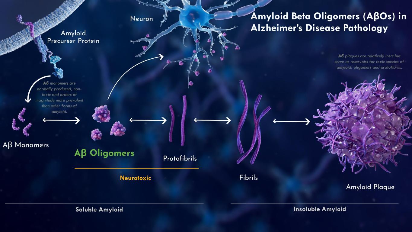 Amyloid Beta Oligomers (AβOs) in Alzheimer’s Disease Pathology Aβ monomers are normally produced, non- toxic and orders of magnitude more prevalent than other forms of amyloid. Aβ plaques are relatively inert but serve as reservoirs for toxic species of amyloid: oligomers and protofibrils. Neurotoxic Soluble Amyloid Insoluble Amyloid