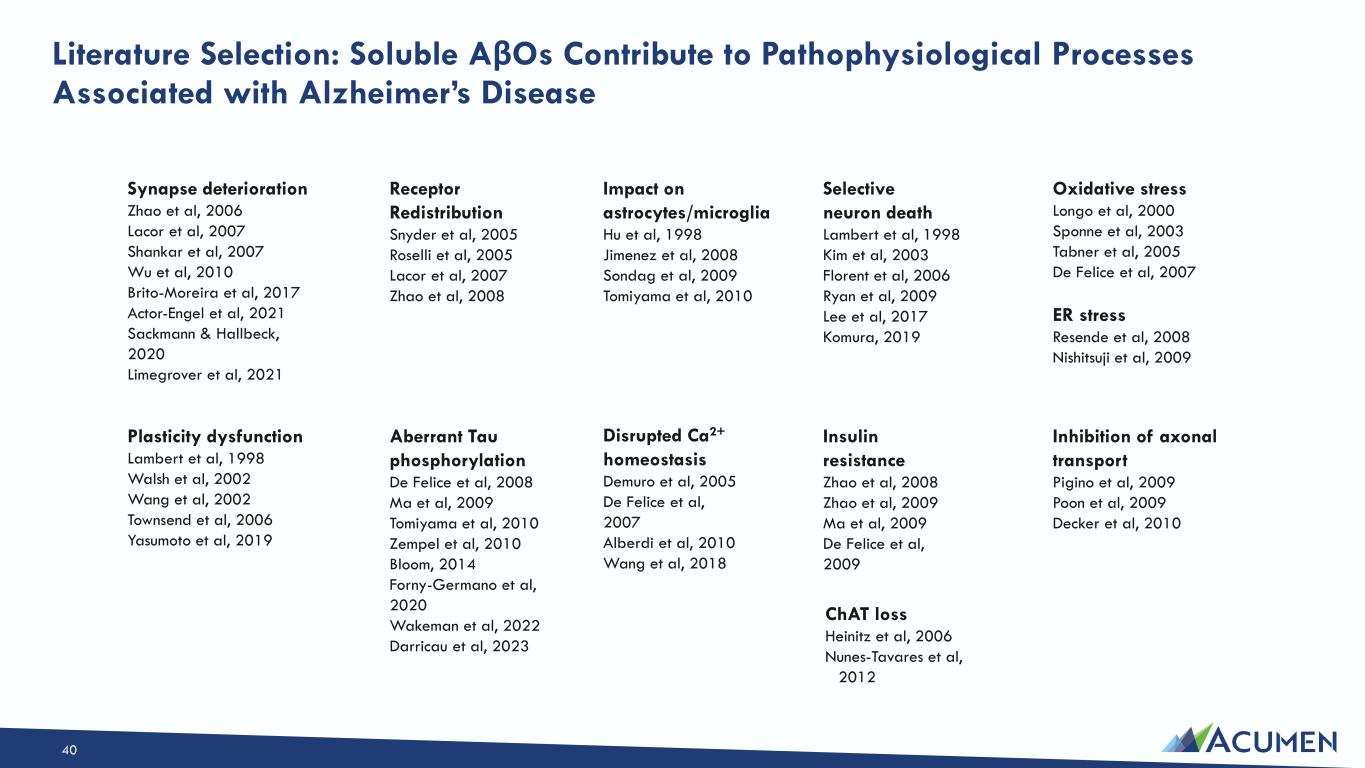 Literature Selection: Soluble AβOs Contribute to Pathophysiological Processes Associated with Alzheimer’s Disease Disrupted Ca2+ homeostasis Demuro et al, 2005 De Felice et al, 2007 Alberdi et al, 2010 Wang et al, 2018 ChAT loss Heinitz et al, 2006 Nunes-Tavares et al, 2012 Inhibition of axonal transport Pigino et al, 2009 Poon et al, 2009 Decker et al, 2010 Oxidative stress Longo et al, 2000 Sponne et al, 2003 Tabner et al, 2005 De Felice et al, 2007 ER stress Resende et al, 2008 Nishitsuji et al, 2009 Insulin resistance Zhao et al, 2008 Zhao et al, 2009 Ma et al, 2009 De Felice et al, 2009 Impact on astrocytes/microglia Hu et al, 1998 Jimenez et al, 2008 Sondag et al, 2009 Tomiyama et al, 2010 Aberrant Tau phosphorylation De Felice et al, 2008 Ma et al, 2009 Tomiyama et al, 2010 Zempel et al, 2010 Bloom, 2014 Forny-Germano et al, 2020 Wakeman et al, 2022 Darricau et al, 2023 Selective neuron death Lambert et al, 1998 Kim et al, 2003 Florent et al, 2006 Ryan et al, 2009 Lee et al, 2017 Komura, 2019 Plasticity dysfunction Lambert et al, 1998 Walsh et al, 2002 Wang et al, 2002 Townsend et al, 2006 Yasumoto et al, 2019 Synapse deterioration Zhao et al, 2006 Lacor et al, 2007 Shankar et al, 2007 Wu et al, 2010 Brito-Moreira et al, 2017 Actor-Engel et al, 2021 Sackmann & Hallbeck, 2020 Limegrover et al, 2021 Receptor Redistribution Snyder et al, 2005 Roselli et al, 2005 Lacor et al, 2007 Zhao et al, 2008 40