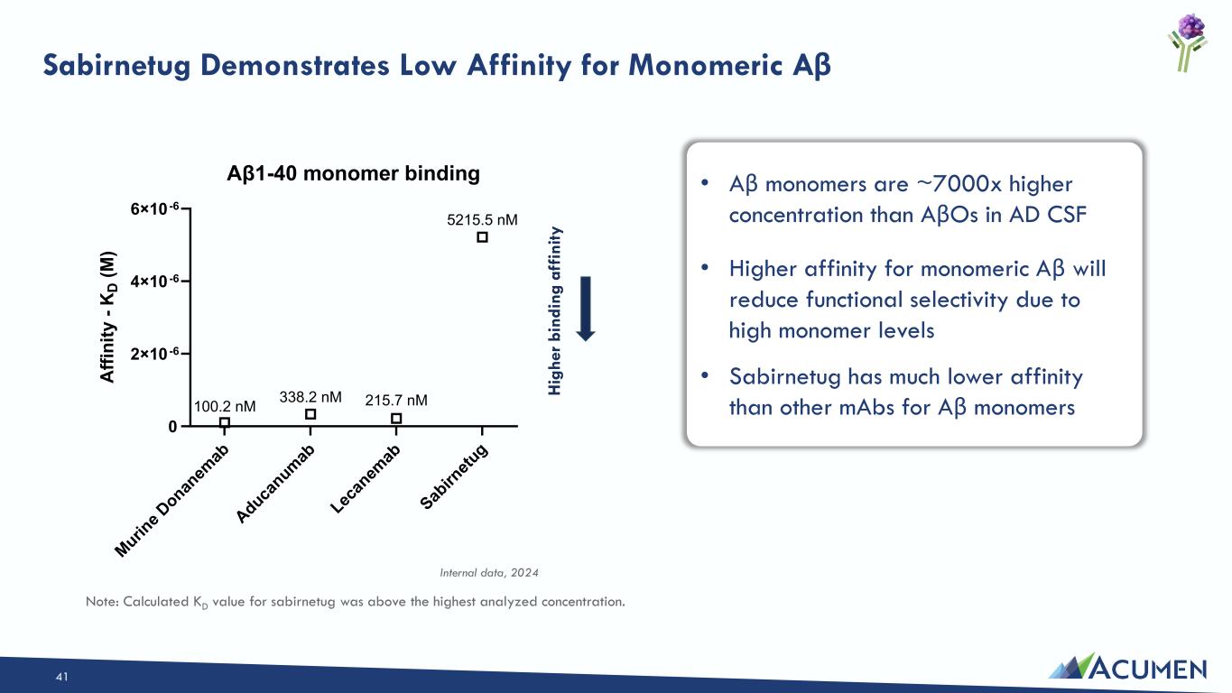 • Aβ monomers are ~7000x higher concentration than AβOs in AD CSF • Higher affinity for monomeric Aβ will reduce functional selectivity due to high monomer levels • Sabirnetug has much lower affinity than other mAbs for Aβ monomers Sabirnetug Demonstrates Low Affinity for Monomeric Aβ 41 M urin e D onan em ab A duca num ab Lec an em ab S ab irn et ug 0 2×10 -6 4×10 -6 6×10 -6 Aβ1-40 monomer binding A ff in it y - K D ( M ) 100.2 nM 338.2 nM 215.7 nM 5215.5 nM H ig h e r b in d in g a ff in it y Internal data, 2024 Note: Calculated KD value for sabirnetug was above the highest analyzed concentration.
