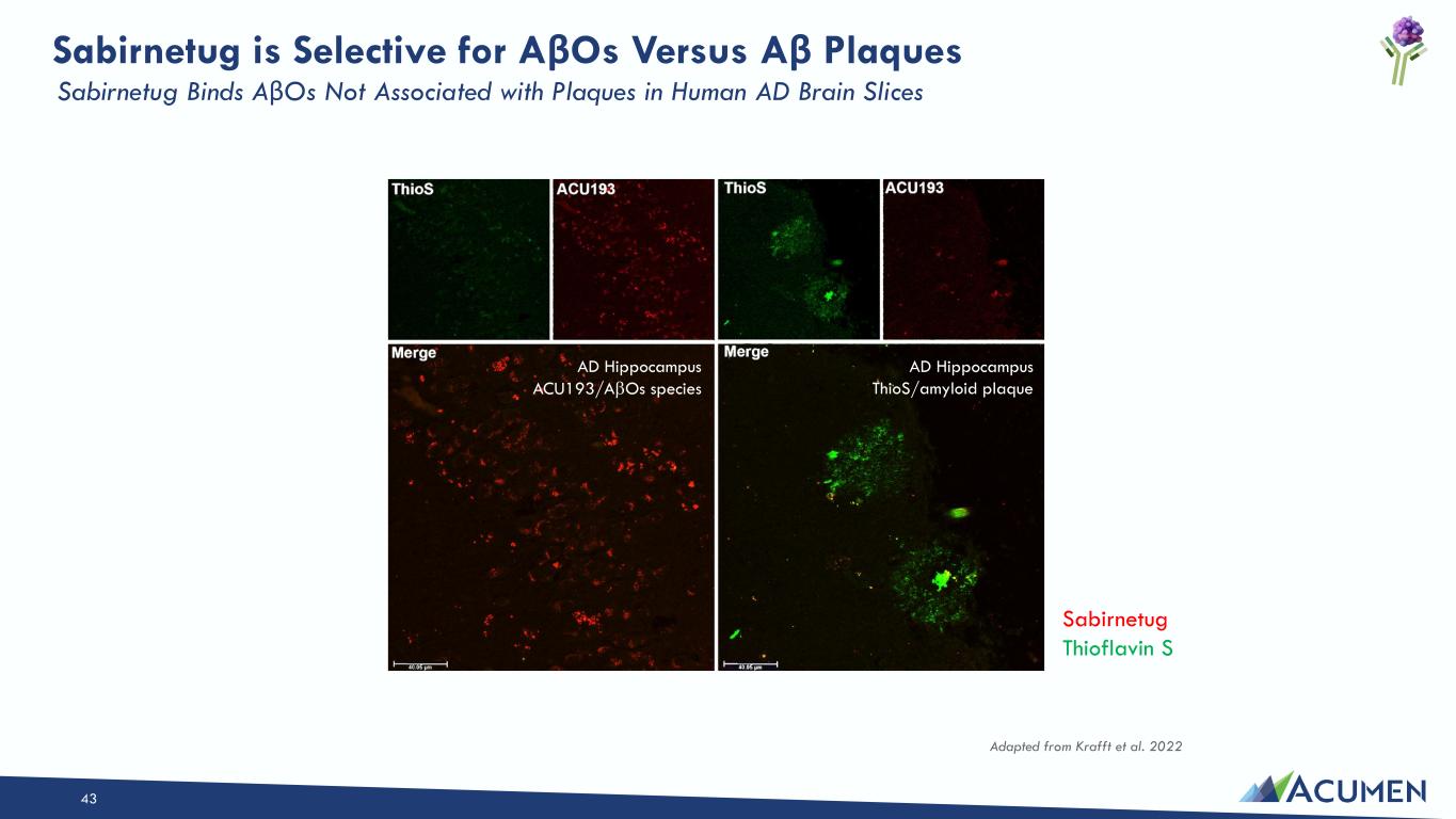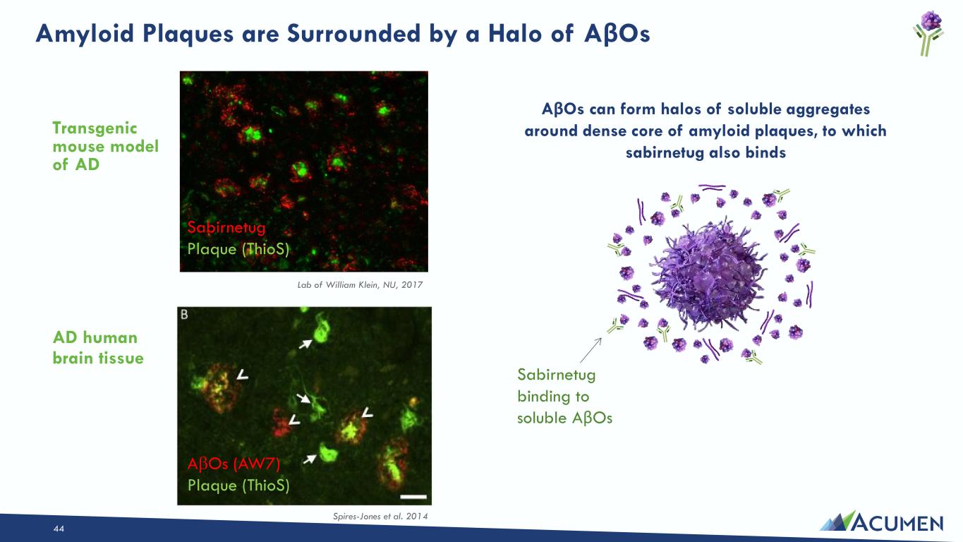 43 AD Hippocampus ThioS/amyloid plaque AD Hippocampus ACU193/AOs species Sabirnetug is Selective for AβOs Versus Aβ Plaques Sabirnetug Thioflavin S Sabirnetug Binds AβOs Not Associated with Plaques in Human AD Brain Slices Adapted from Krafft et al. 2022