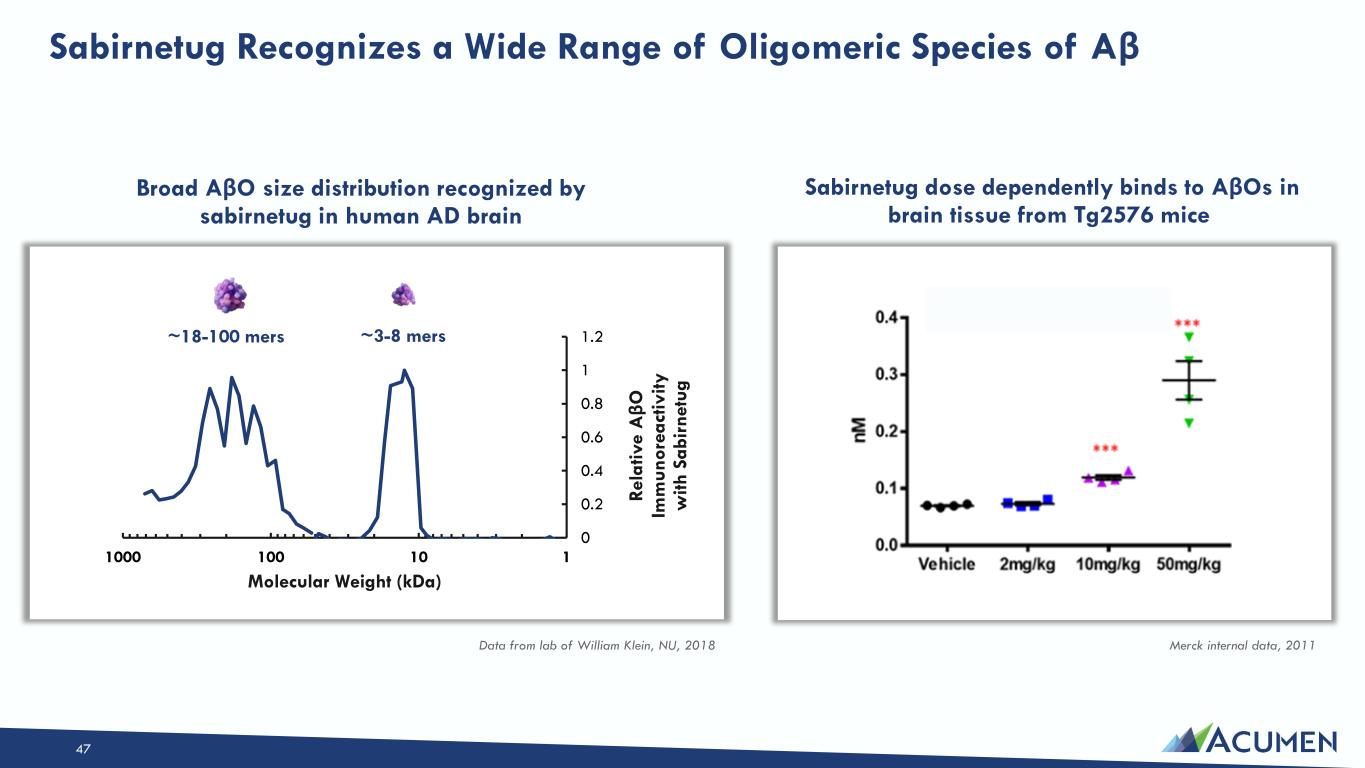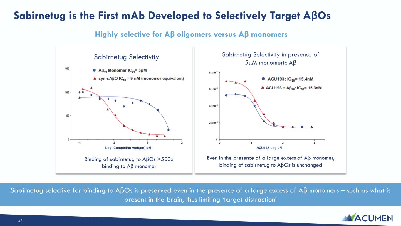 Highly selective for Aβ oligomers versus Aβ monomers Even in the presence of a large excess of Aβ monomer, binding of sabirnetug to AβOs is unchanged Binding of sabirnetug to AβOs >500x binding to Aβ monomer Log [Competing Antigen] μM Sabirnetug Selectivity Sabirnetug Selectivity in presence of 5μM monomeric Aβ ACU193 Log μM Sabirnetug is the First mAb Developed to Selectively Target AβOs Sabirnetug selective for binding to AβOs is preserved even in the presence of a large excess of Aβ monomers – such as what is present in the brain, thus limiting ‘target distraction’ 46