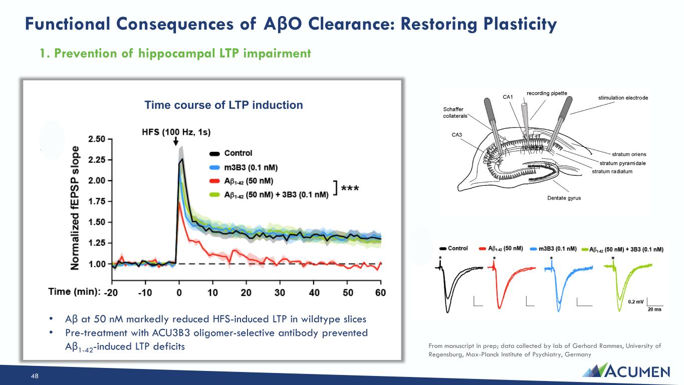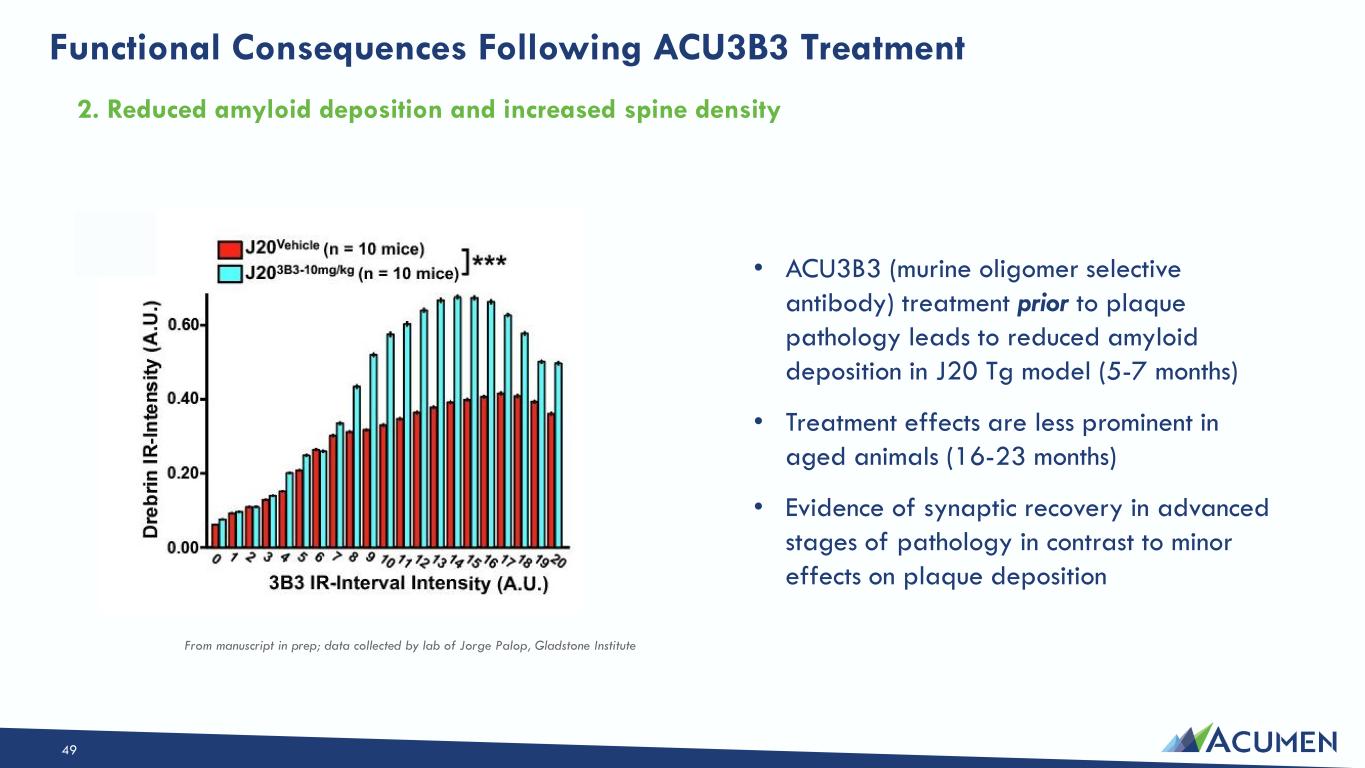 1. Prevention of hippocampal LTP impairment Functional Consequences of AβO Clearance: Restoring Plasticity 48 • Aβ at 50 nM markedly reduced HFS-induced LTP in wildtype slices • Pre-treatment with ACU3B3 oligomer-selective antibody prevented Aβ1-42-induced LTP deficits Time course of LTP induction From manuscript in prep; data collected by lab of Gerhard Rammes, University of Regensburg, Max-Planck Institute of Psychiatry, Germany