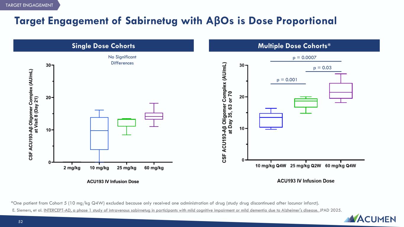 Target Engagement of Sabirnetug with AβOs is Dose Proportional 52 Single Dose Cohorts Multiple Dose Cohorts* 2 mg/kg 10 mg/kg 25 mg/kg 60 mg/kg 0 10 20 30 ACU193 IV Infusion Dose C S F A C U 1 9 3 -A β O li g o m e r C o m p le x ( A U /m L ) a t V is it 8 ( D a y 2 1 ) *One patient from Cohort 5 (10 mg/kg Q4W) excluded because only received one administration of drug (study drug discontinued after lacunar infarct). TARGET ENGAGEMENT p = 0.001 p = 0.03 p = 0.0007No Significant Differences E. Siemers, et al. INTERCEPT-AD, a phase 1 study of intravenous sabirnetug in participants with mild cognitive impairment or mild dementia due to Alzheimer's disease. JPAD 2025.