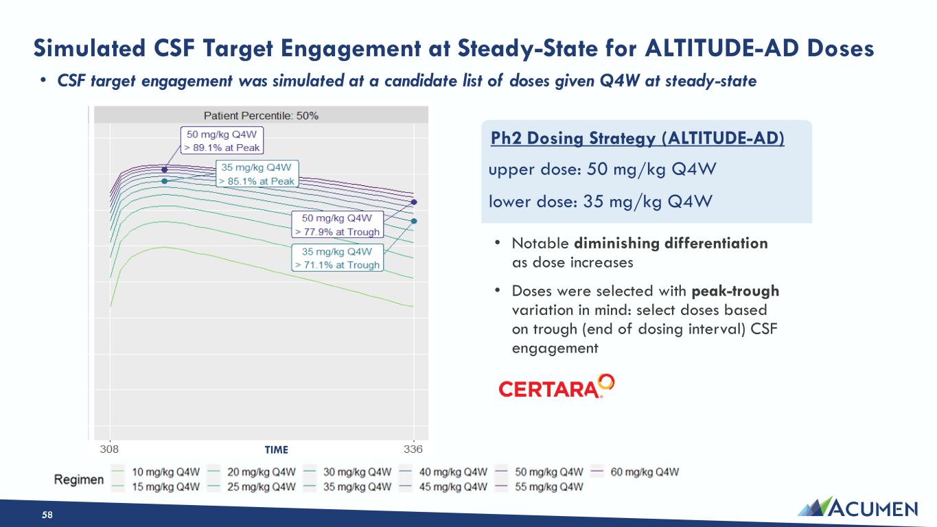 Simulated CSF Target Engagement at Steady-State for ALTITUDE-AD Doses • CSF target engagement was simulated at a candidate list of doses given Q4W at steady-state • Notable diminishing differentiation as dose increases • Doses were selected with peak-trough variation in mind: select doses based on trough (end of dosing interval) CSF engagement upper dose: 50 mg/kg Q4W lower dose: 35 mg/kg Q4W Ph2 Dosing Strategy (ALTITUDE-AD) TIME 58